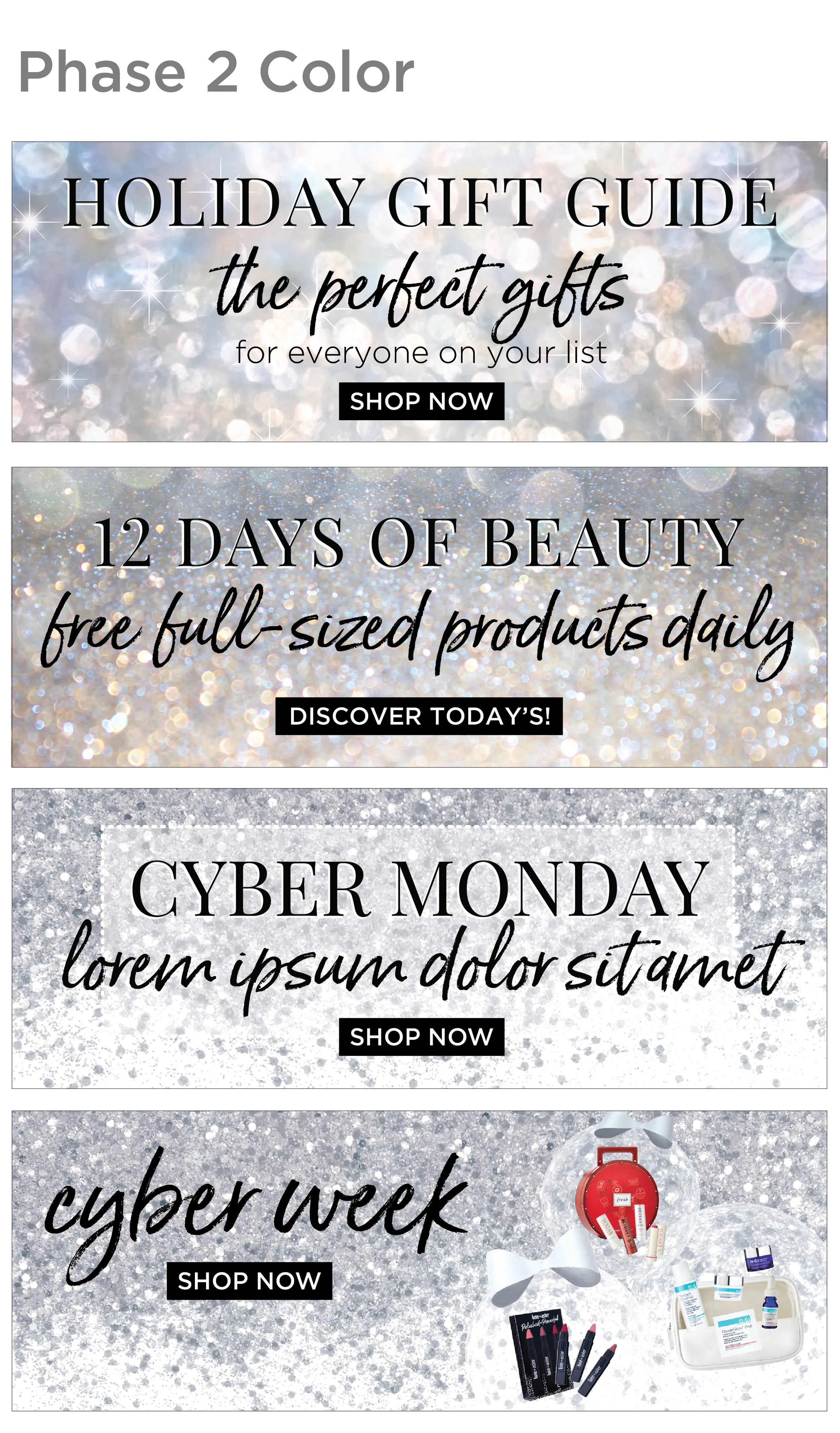 Below are some preliminary site graphics that show how the holiday campaign evolves from Black Friday to New Year’s.