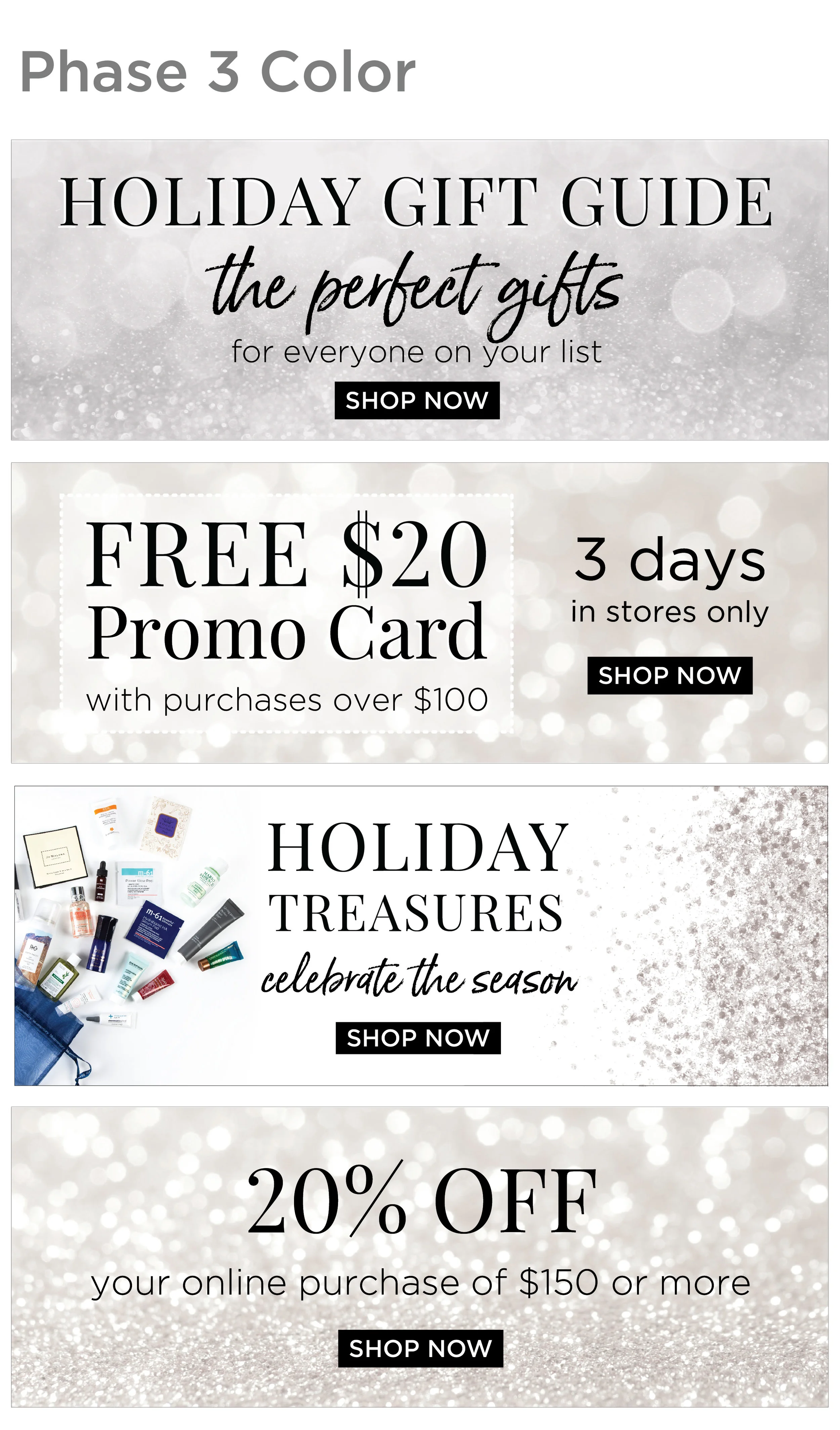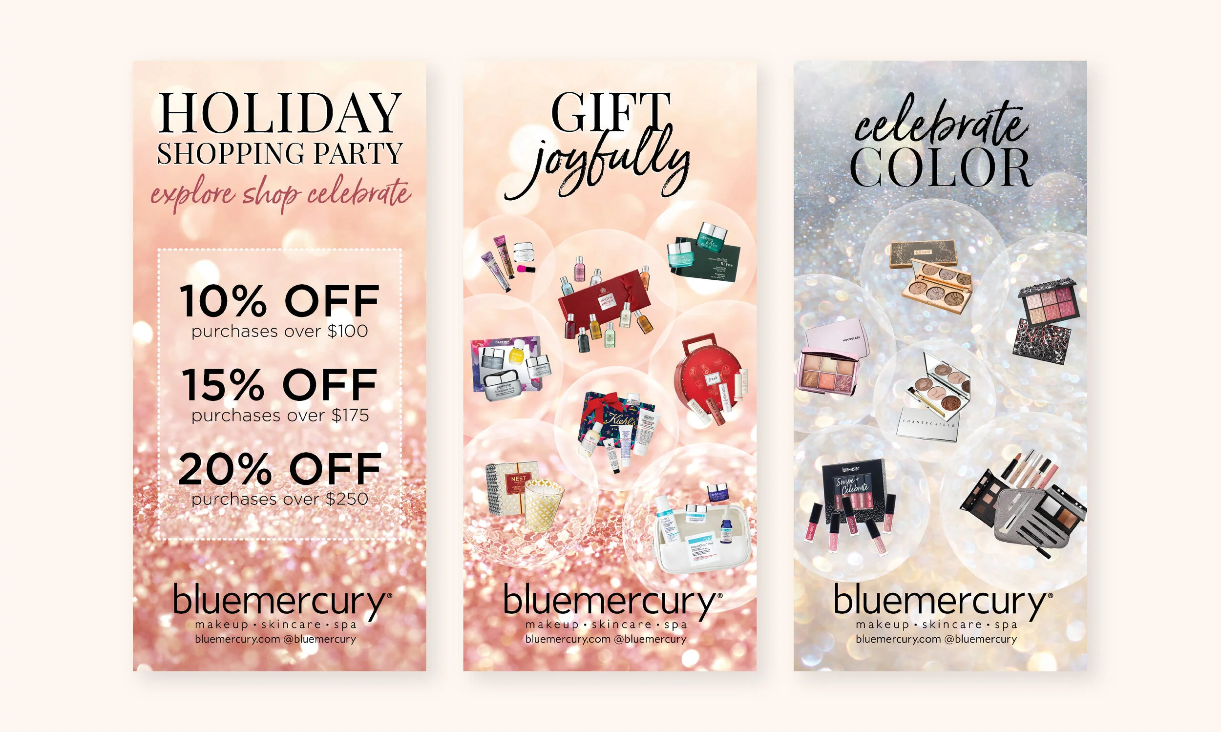 Large format prints that hung in every Bluemercury retail store window during the holiday season. Each store had a different variation of these banners because each store carries different brands. I photoshopped all products into spherized bubbles to have an effervescent, floating effect. I worked closely with the in-house photographer to generate the right types of product photography.