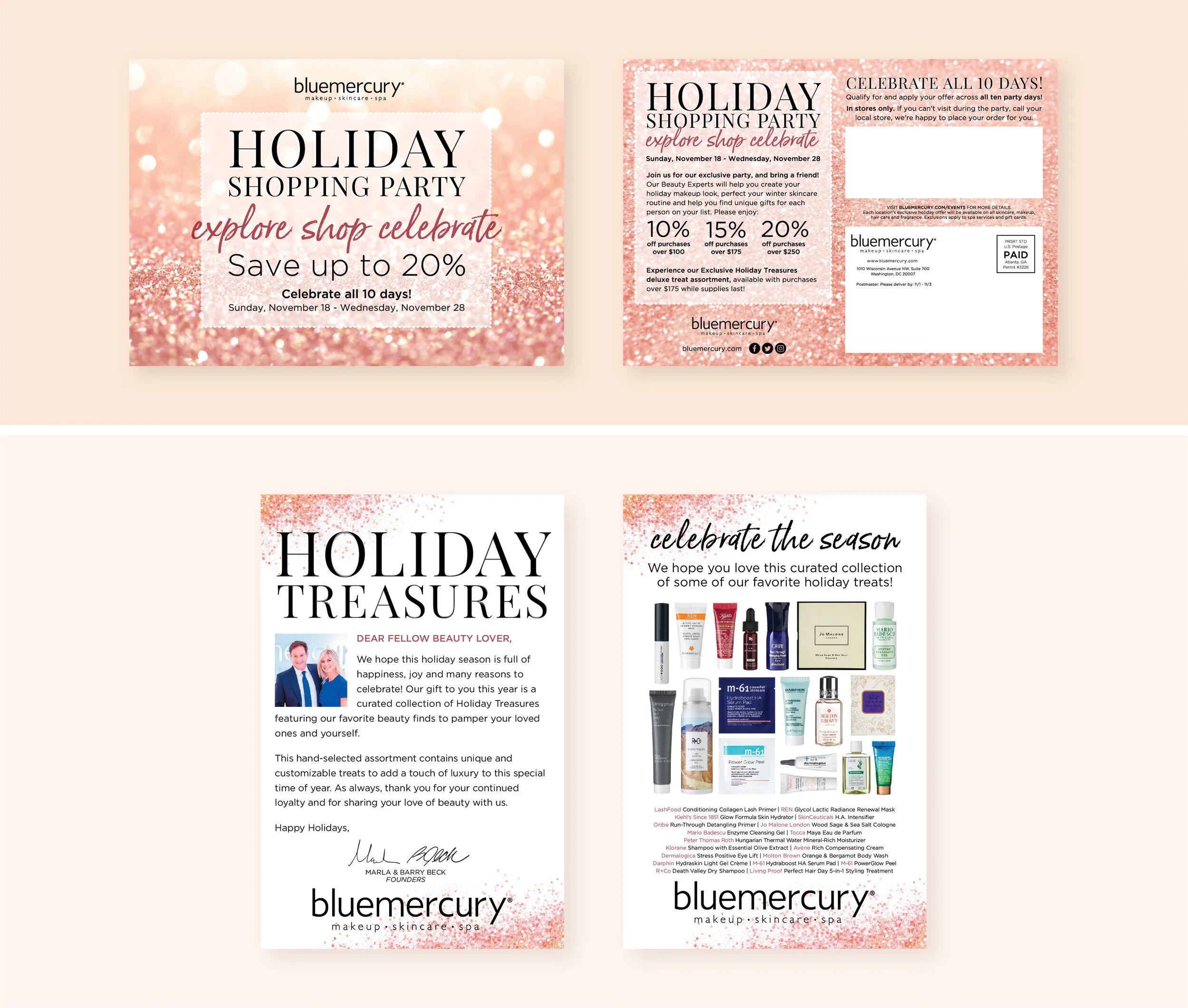 Designed both a postcard that was mailed to every Bluemercury customer and a printed card that accompanied deluxe samples in a promotional holiday bag.